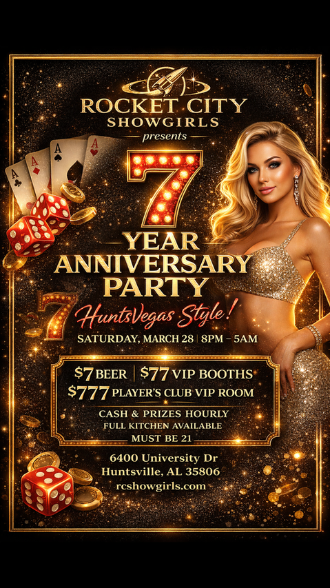 Welcome to Rocket City Showgirls, Huntsville’s premier destination for upscale adult entertainment. We blend Southern charm with unapologetic confidence, creating an atmosphere where fantasy feels effortless and every night shimmers with possibility.